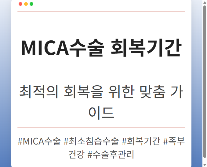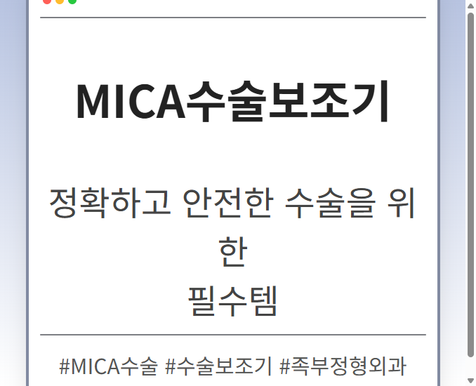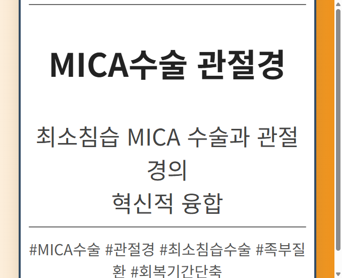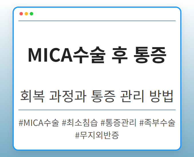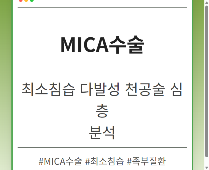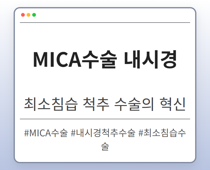 목차 MICA수술이란 무엇일까요? MICA수술의 장점 MICA수술 과정 MICA수술, 모든 환자에게 적합할까요? MICA수술 후기: 환자들의 생생한 경험담 긍정적인 후기 주의해야 할