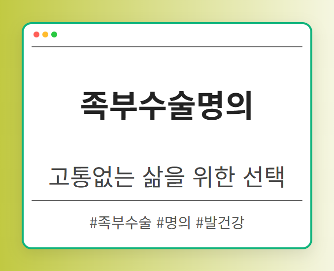 목차 족부수술, 왜 명의를 찾아야 할까요? 족부 질환 종류와 수술의 필요성 명의 선택의 중요성 족부수술 명의, 어떻게 찾을 수 있을까요?