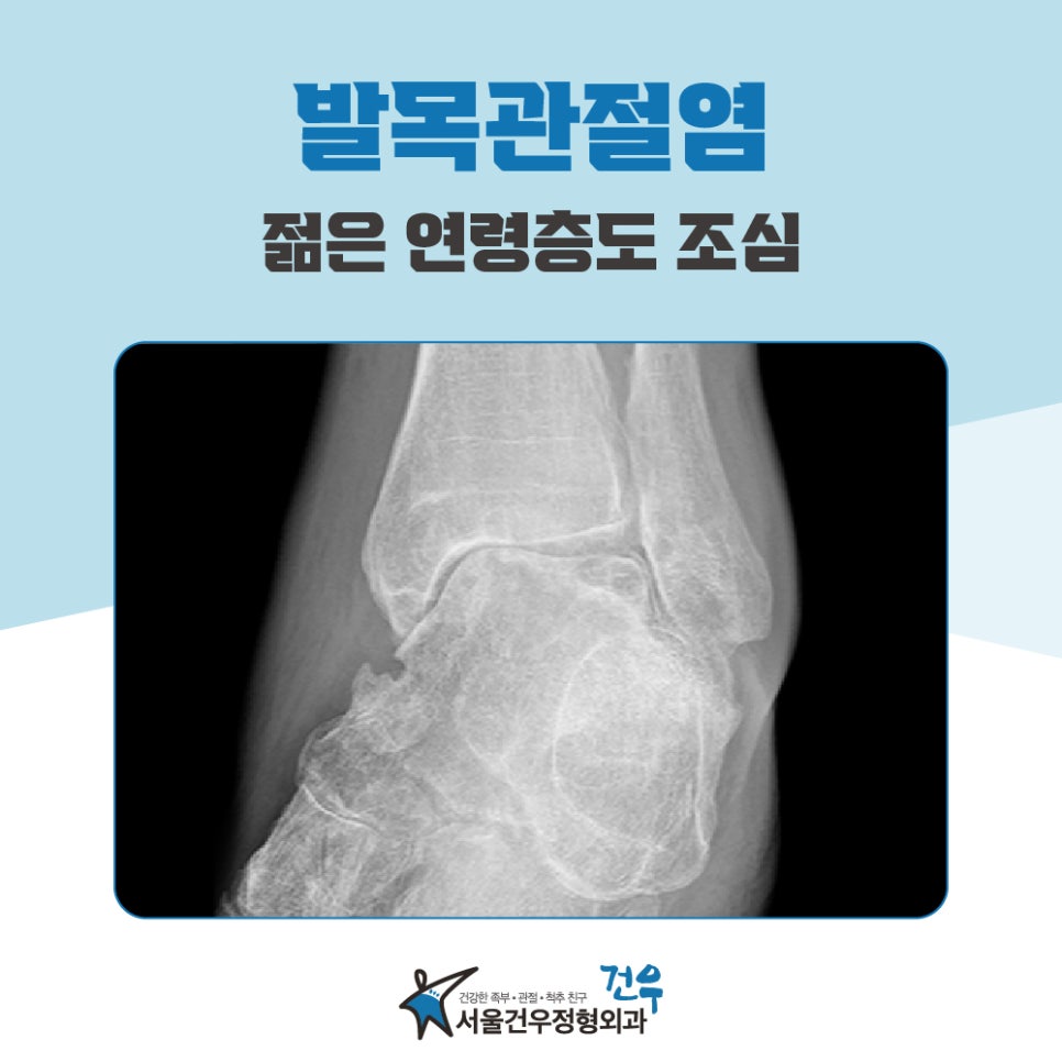 서울건우정형외과 발목관절염 조심해야 할 이유 서울건우정형외과 전문의들은 최근 발목관절염에 대한 젊은 연령층의 증가에 경각심을 갖고 있습니다. 발목관절염은 주로 노인들이 앓는