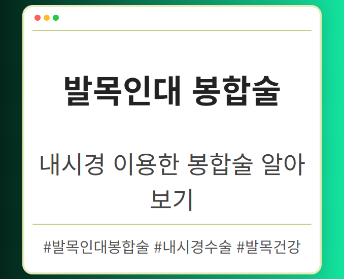 목차 발목인대파열 봉합술이 필요한 이유 발목인대파열의 진단과 초기 대응 봉합술의 종류와 선택 봉합술 전후 주의사항 성공적인 발목인대파열 봉합술 후 재활